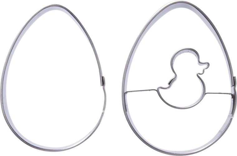 Praktická sada dvou vykrajovátek ve tvaru vajíčka z kvalitní nerezové oceli pro snadnou výrobu sušenek, perníčků a fondánových ozdob. Rozměr jednoho vykrajovátka je 5,5 × 3,8 × 1,6 cm. Jsou odolná, univerzální a vhodná i do myčky nádobí.