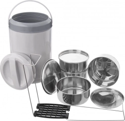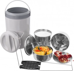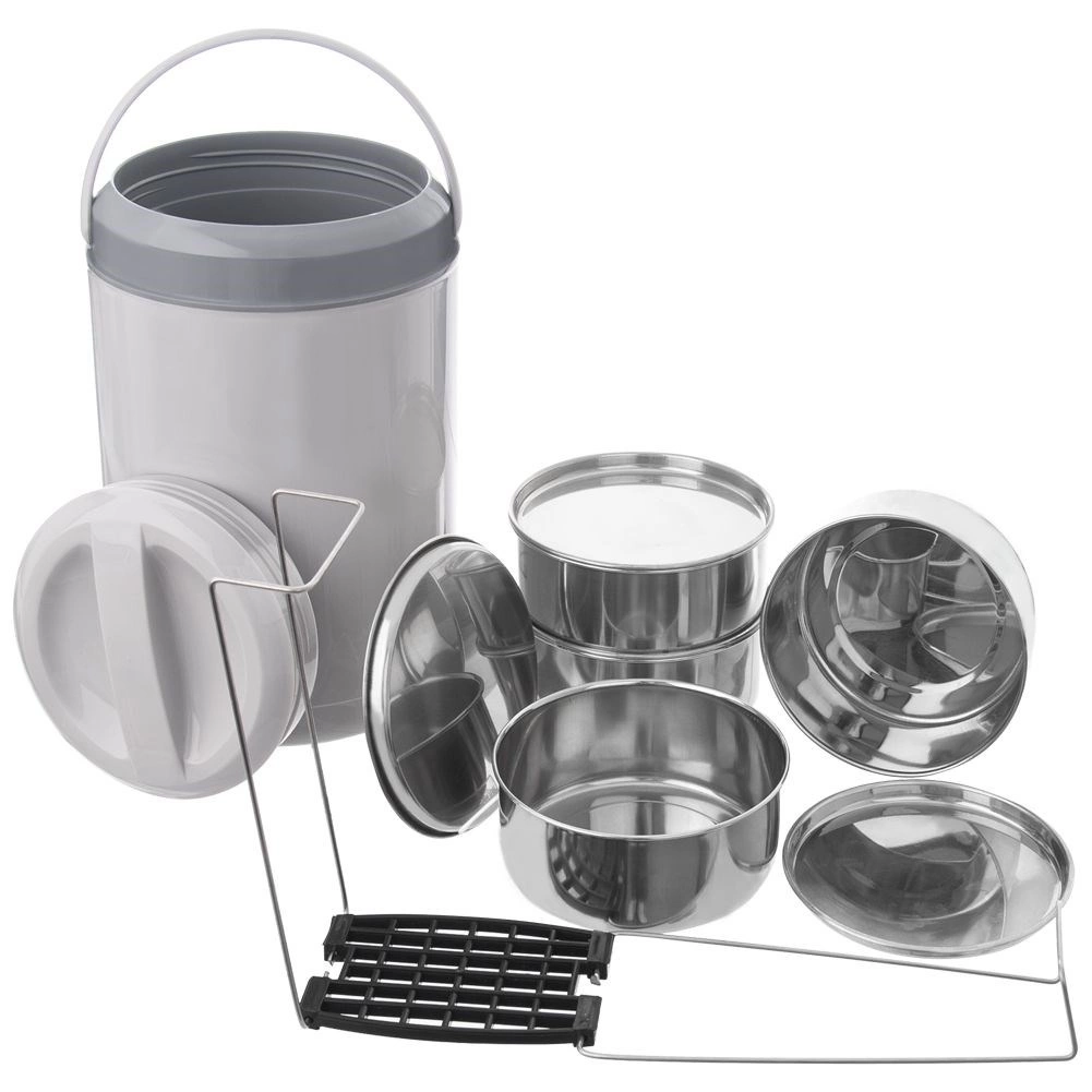 Objevte spolehlivý způsob, jak přenášet celé menu v jednom setu. Čtyři samostatné nerezové nádoby (každá 800 ml) se zavíratelnými víčky jsou spojeny pevným stojenem, který zajišťuje stabilní a přehledné stohování. Šedý izolační obal s uchem pomáhá udržet teplotu jídel a umožňuje pohodlné a bezpečné přenášení.