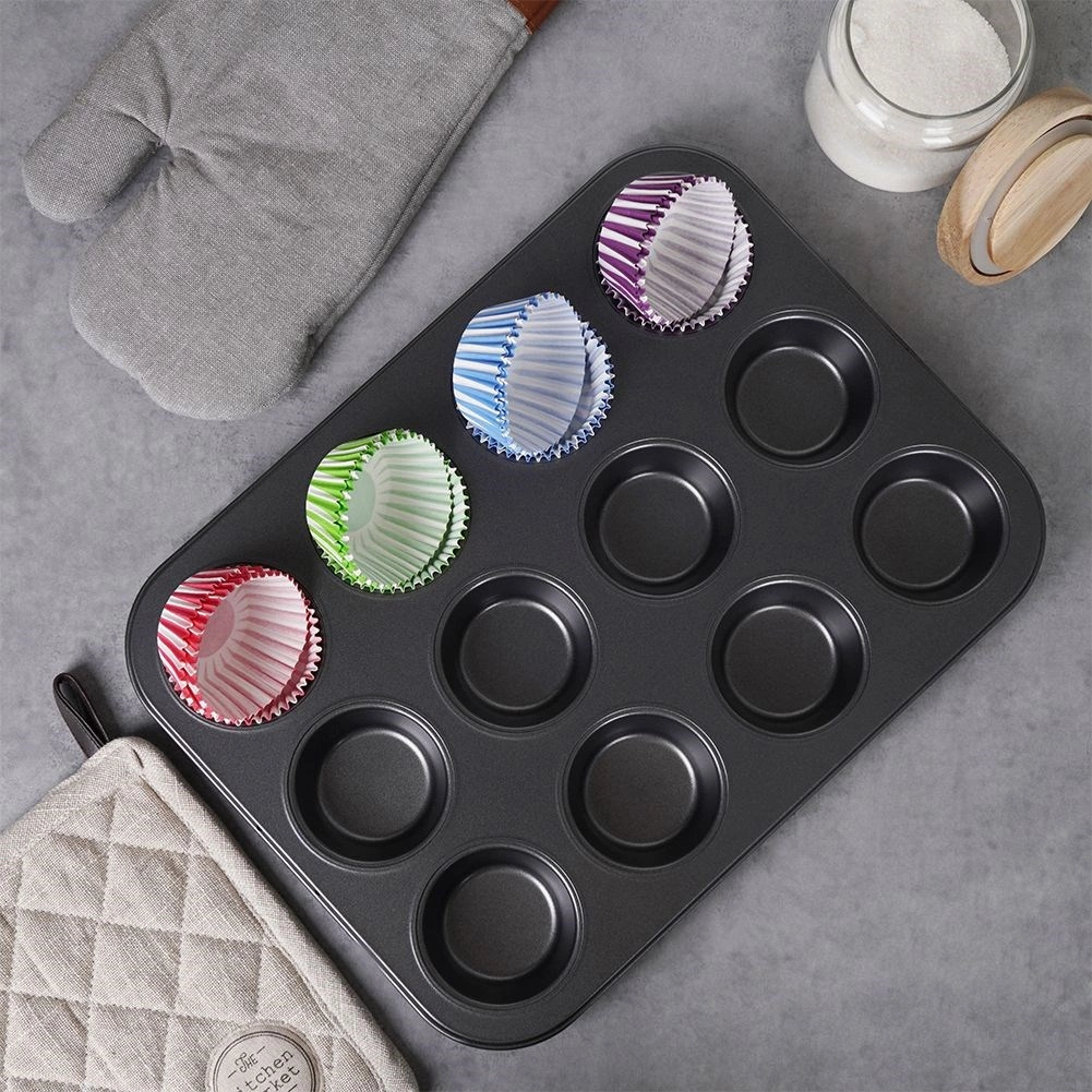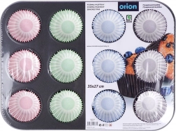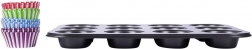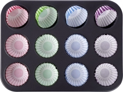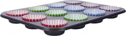 Tato kvalitní forma na muffiny o rozměrech 35 × 27 × 3 cm má 12 rovnoměrně rozmístěných jamek s horním průměrem 6,5 cm. Odolný kov s nepřilnavou povrchovou úpravou zajistí snadné vyklopení i při použití minimálního množství tuku. Součástí balení je 72 kusů papírových košíčků v různých barvách pro čisté pečení a atraktivní prezentaci.