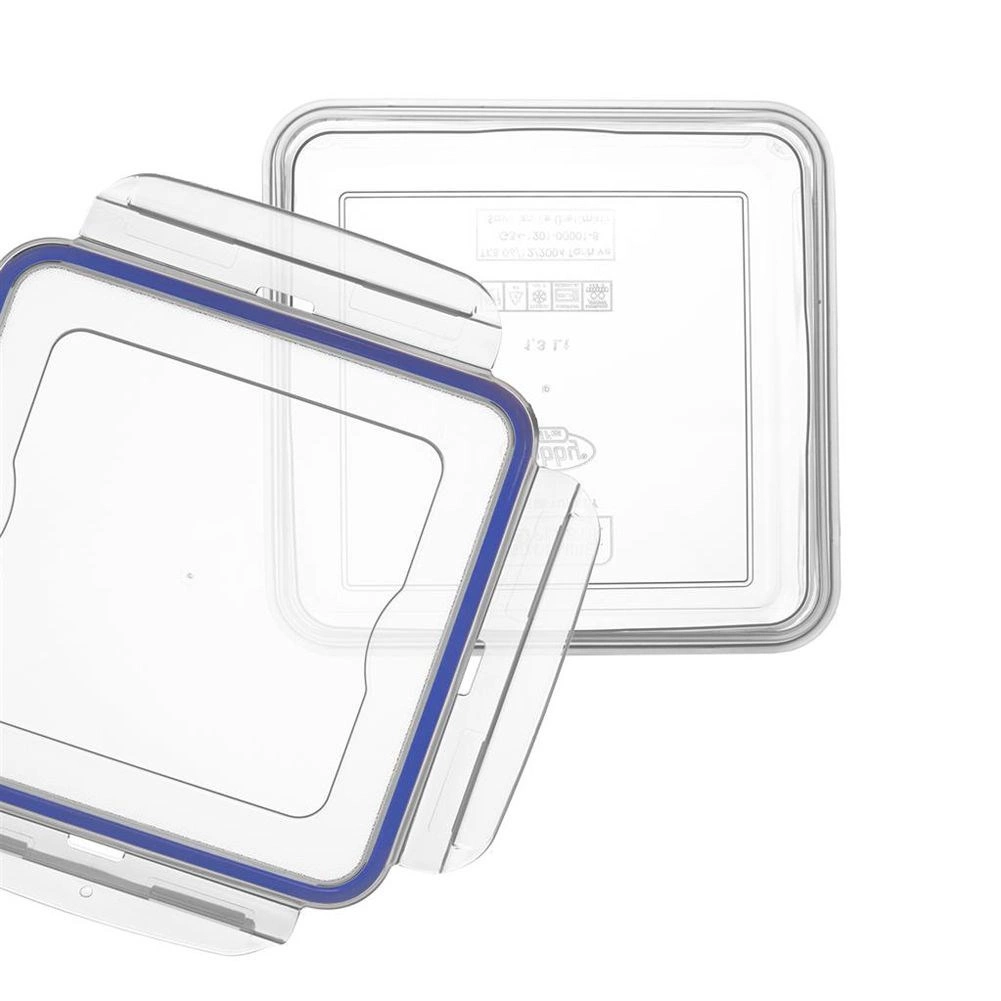 Praktická čtvercová dóza (10 × 10 × 6 cm) z kvalitního transparentního plastu udrží vaše potraviny déle čerstvé díky silikonovému těsnění a čtyřem uzamykacím klipům. Perfektní pro každodenní použití doma, v práci i na cestách – bez obav z vytékání.
