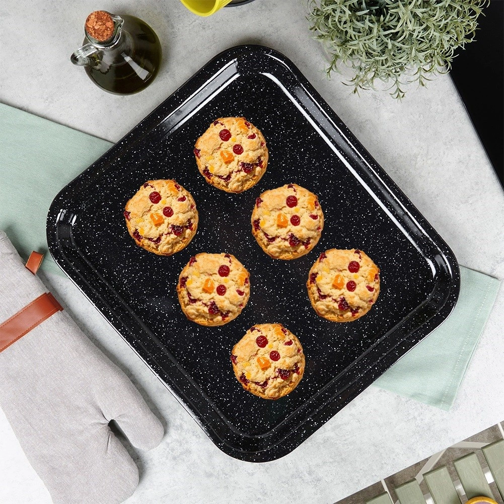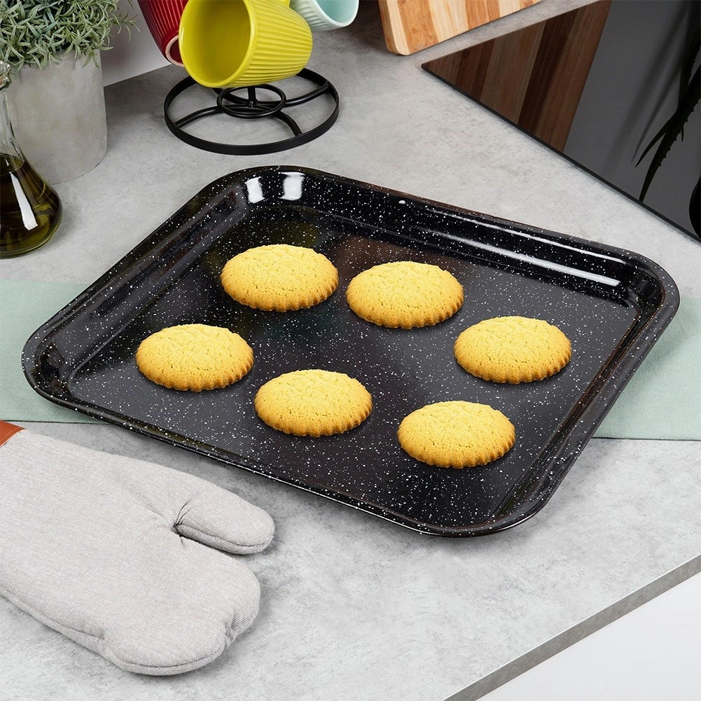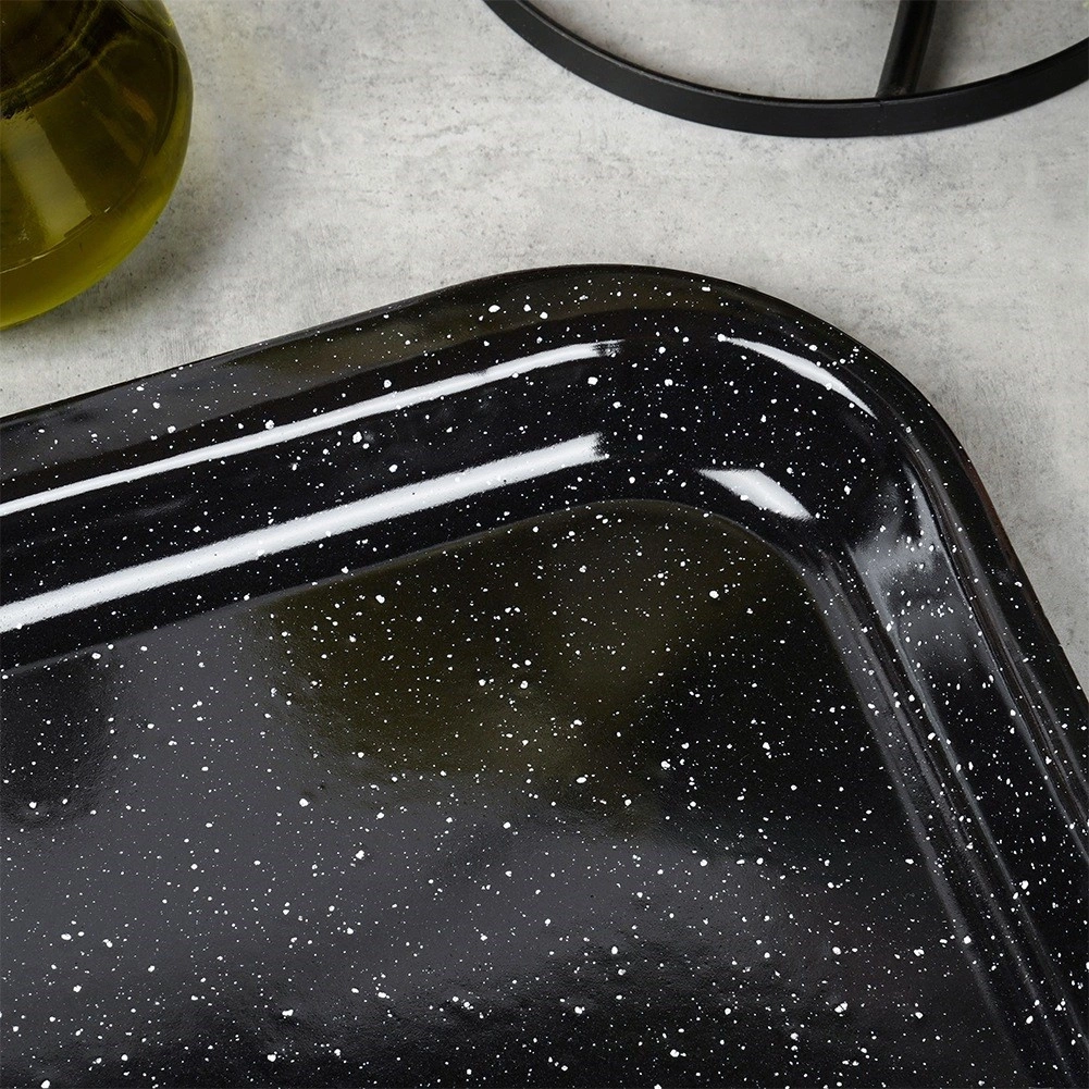 Emailovaný plech je vyroben z odolné oceli s černou, lesklou vrstvou smaltu, která je zdravotně nezávadná a vhodná i pro alergiky. Vnitřní rozměr 36,5 × 34 × 2,5 cm poskytuje dostatek prostoru pro pečení masa, zeleniny, sušenek i koláčů.
