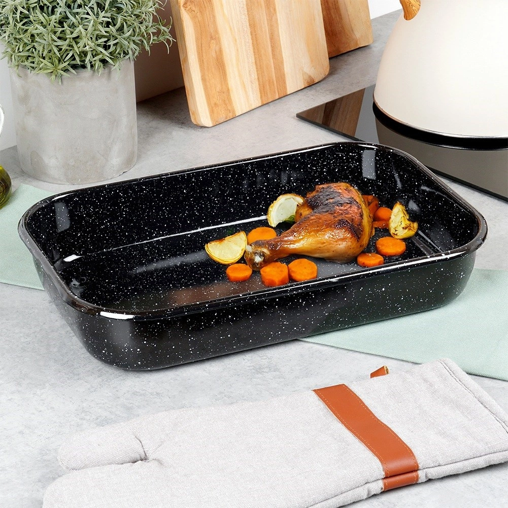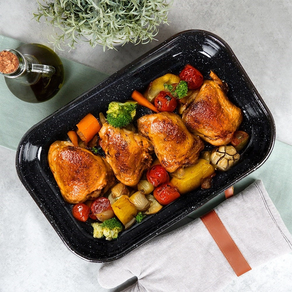 Hladký, lesklý povrch minimalizuje přichytávání a usnadňuje údržbu – pekáč můžete mýt v myčce. Vysoké okraje pomáhají udržet šťávu a aroma uvnitř pokrmu, takže pečeně zůstává šťavnatá. Vhodné do plynových i elektrických trub.