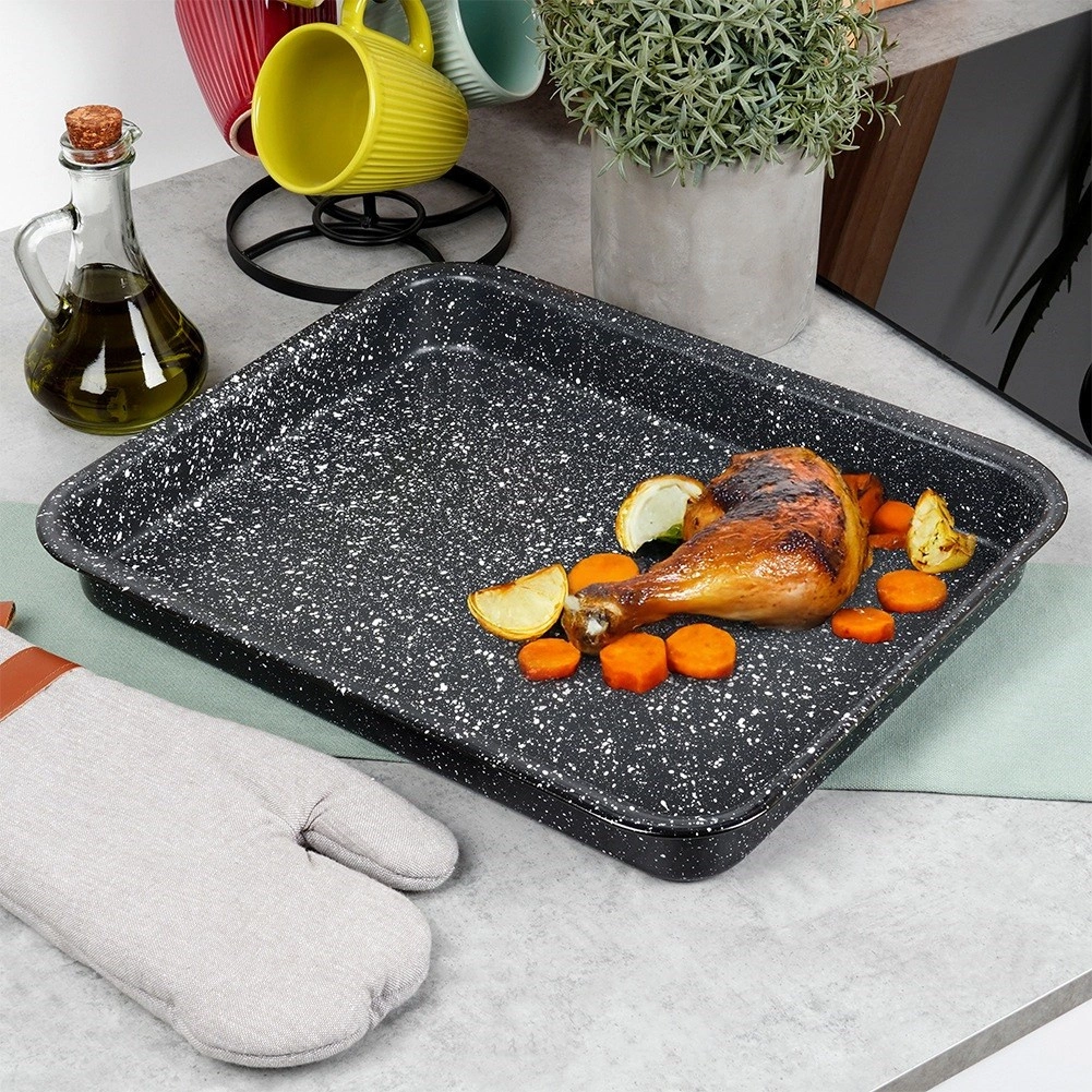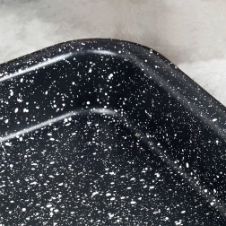 Univerzální pekáč s vysokými okraji vám zajistí rovnoměrné propečení a pohodlnou manipulaci. Vnitřní granitová nepřilnavá vrstva minimalizuje připalování i při použití malého množství tuku a je odolná proti poškrábání. Smaltovaný kov v elegantní černé barvě je odolný a dlouhodobě drží tvar.