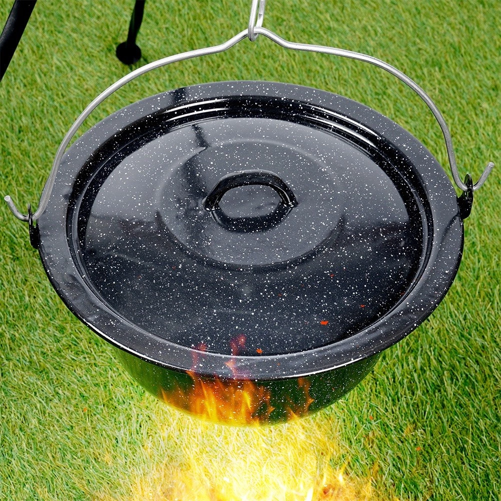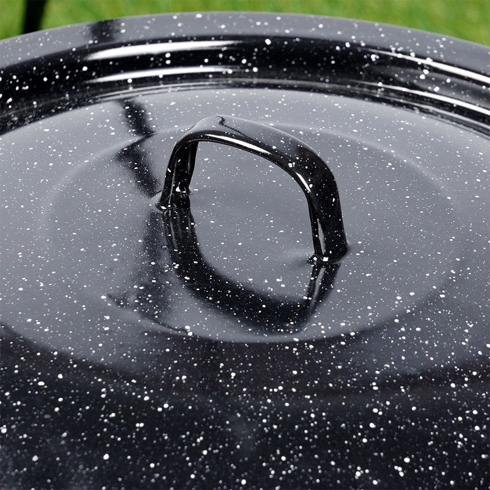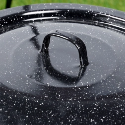 Robustní poklice z černě skvrnité smaltované oceli je ideální pro vaření v přírodě i na zahradě. Udrží teplo a vlhkost v kotlíku, zrychlí var a zlepší chuť polévek, gulášů či dušených pokrmů. Vhodná pro maďarské kotlíky o objemu 13 l (průměr 40 cm).
