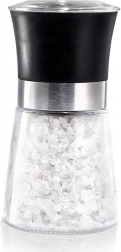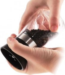 Stylový a praktický mlýnek kombinuje průhledné sklo s černými prvky a nerezovým pásem, takže vždy vidíte stav zásob. Keramický mlecí mechanismus zaručuje plynulé mletí i těch nejtvrdších zrnek pepře a hrubé soli, zatímco nastavení hrubosti vám umožní přizpůsobit výslednou strukturu pokrmu.