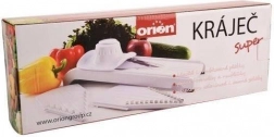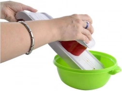 Díky vyměnitelným nástavcům snadno připravíte široké i úzké proužky nebo nastrouháte suroviny podle potřeby. Šikmý tvar umožňuje nastavit kráječ do vodorovné polohy a speciální výřez ulehčuje opření o hranu nádoby pro stabilní práci.