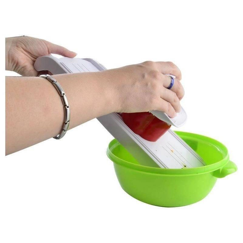 Praktický kráječ na zeleninu a ovoce s rozměry 36 × 12,5 × 4 cm nabízí vyměnitelné nástavce pro krájení a strouhání, ostrý nerezový nůž a bezpečnostní držák pro pohodlnou a bezpečnou práci. Díky pevné konstrukci, šikmému tvaru a zářezu pro opření o okraj mísy je krájení rychlé, přesné a bez námahy.