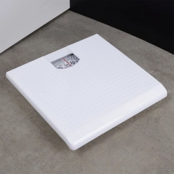 Mechanická koupelnová váha s odolným plastovým tělem a nízkým profilem je ideální pro domácí použití. Díky přehledné stupnici v kilogramech do 120 kg rychle zjistíte svou hmotnost bez čekání a bez nutnosti baterií. Čistý bílý design se hodí do moderních i klasických koupelen.