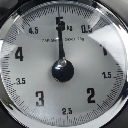 Velký analogový ciferník s dělením po 25 g zajistí rychlou orientaci a přesný výsledek při vážení surovin.