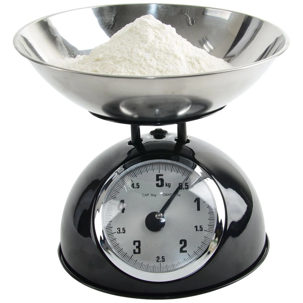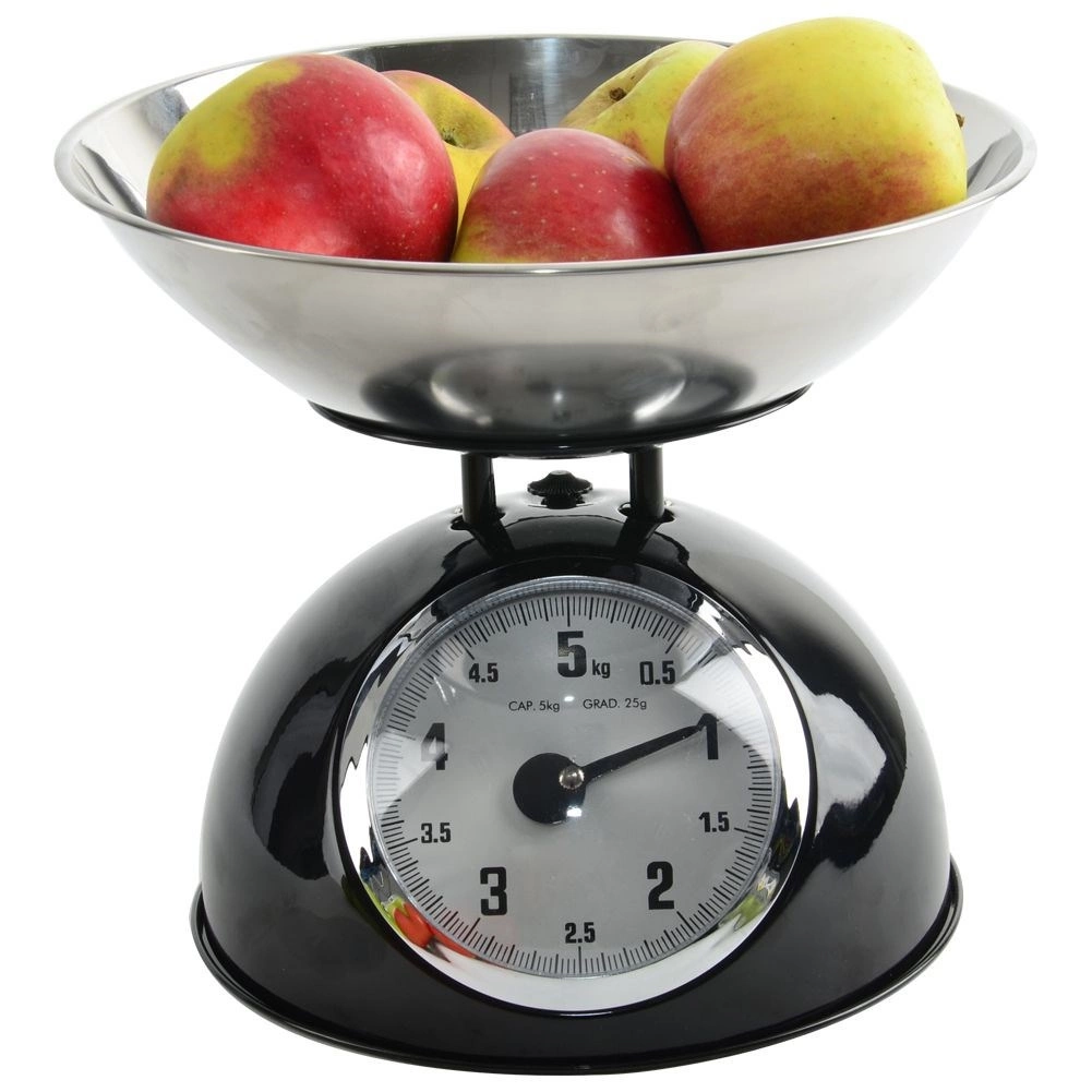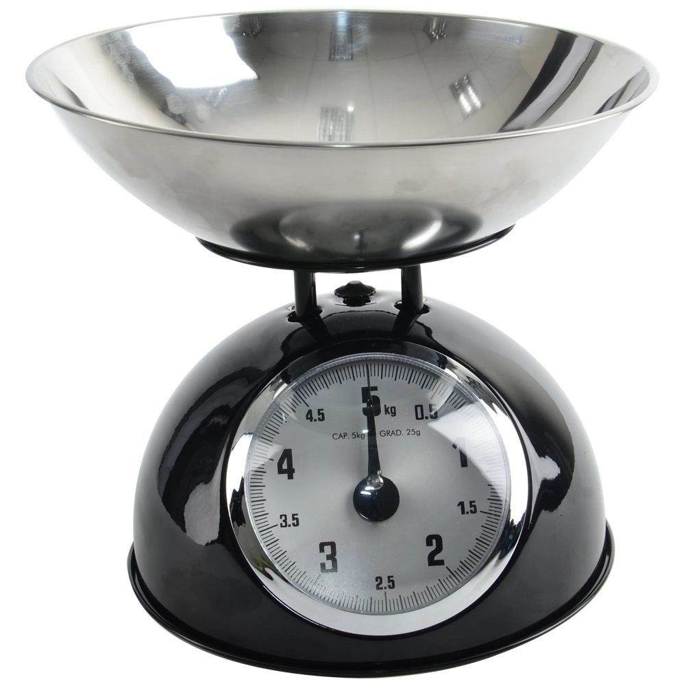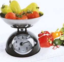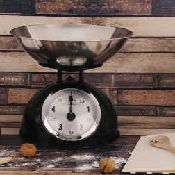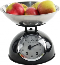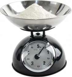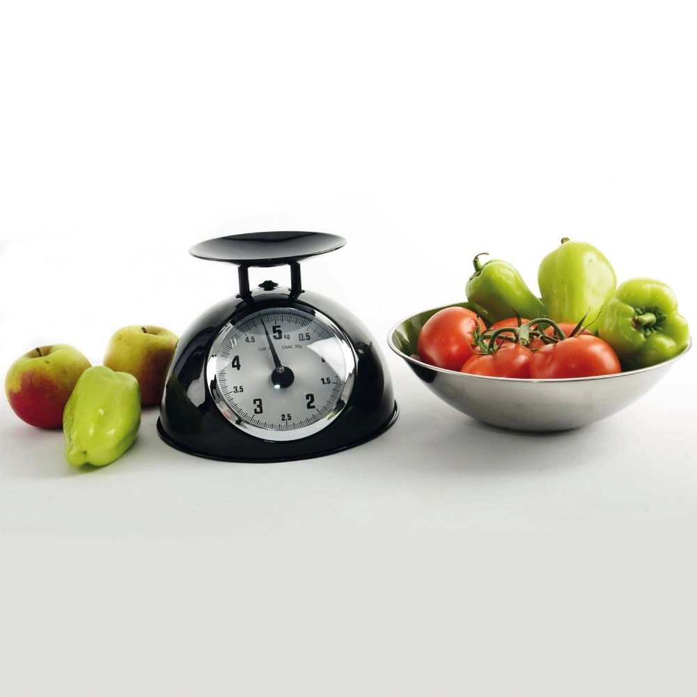 Tato mechanická váha v retro stylu je spolehlivým pomocníkem do každé kuchyně. Robustní kovové tělo v černé barvě a nerezová miska zajišťují dlouhou životnost i snadnou údržbu. Díky analogovému ciferníku s jasným značením do 5 kg snadno zvážíte ovoce, zeleninu, sypké suroviny i maso.