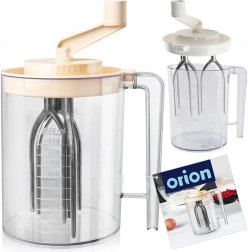 Ruční mixér ORION kombinuje šlehač, metličku a odměrku v jednom. Průhledná nádoba se stupnicí (100–1000 ml a 1/4, 1/2, 3/4, 1 l) usnadní přesné dávkování surovin. Mechanická korbka pohání vnitřní metly, takže mícháte efektivně, bez potřeby elektřiny a bez rozstřikování díky uzavřenému víku.