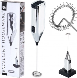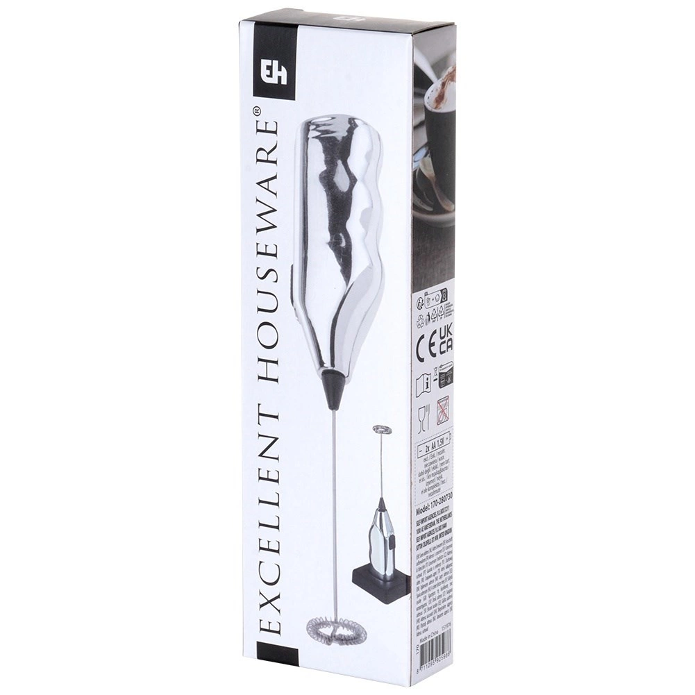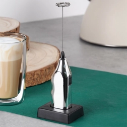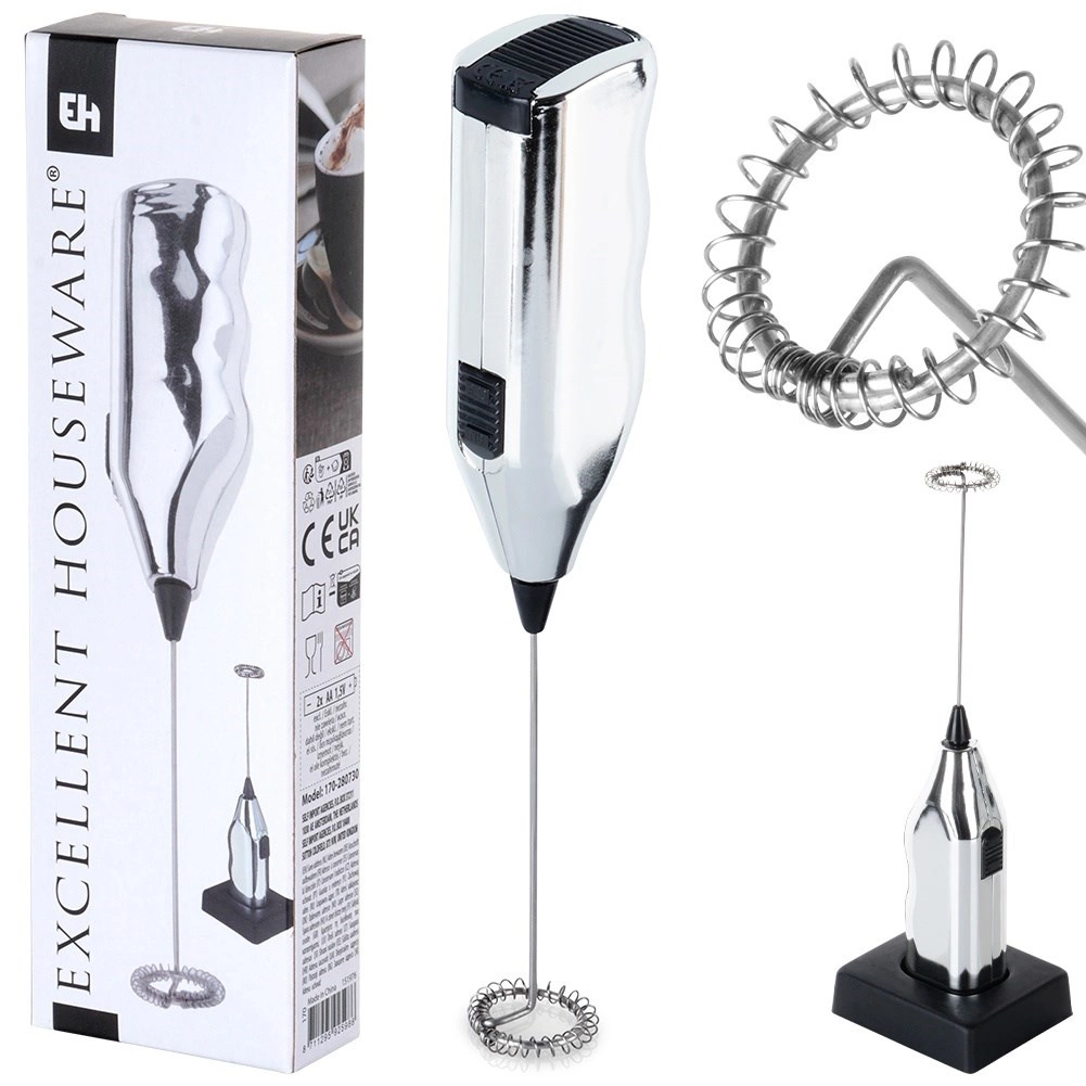 Kompaktní elektrický napěňovač mléka o délce 20 cm se stojánkem pro pohodlné uložení. Nabízí rychlé napěnění mléka pro cappuccino, latte i horkou čokoládu, snadné ovládání jedním tlačítkem a pevné zpracování s kovovým metličkovým nástavcem. Napájení zajišťují 2× AA baterie (nejsou součástí).