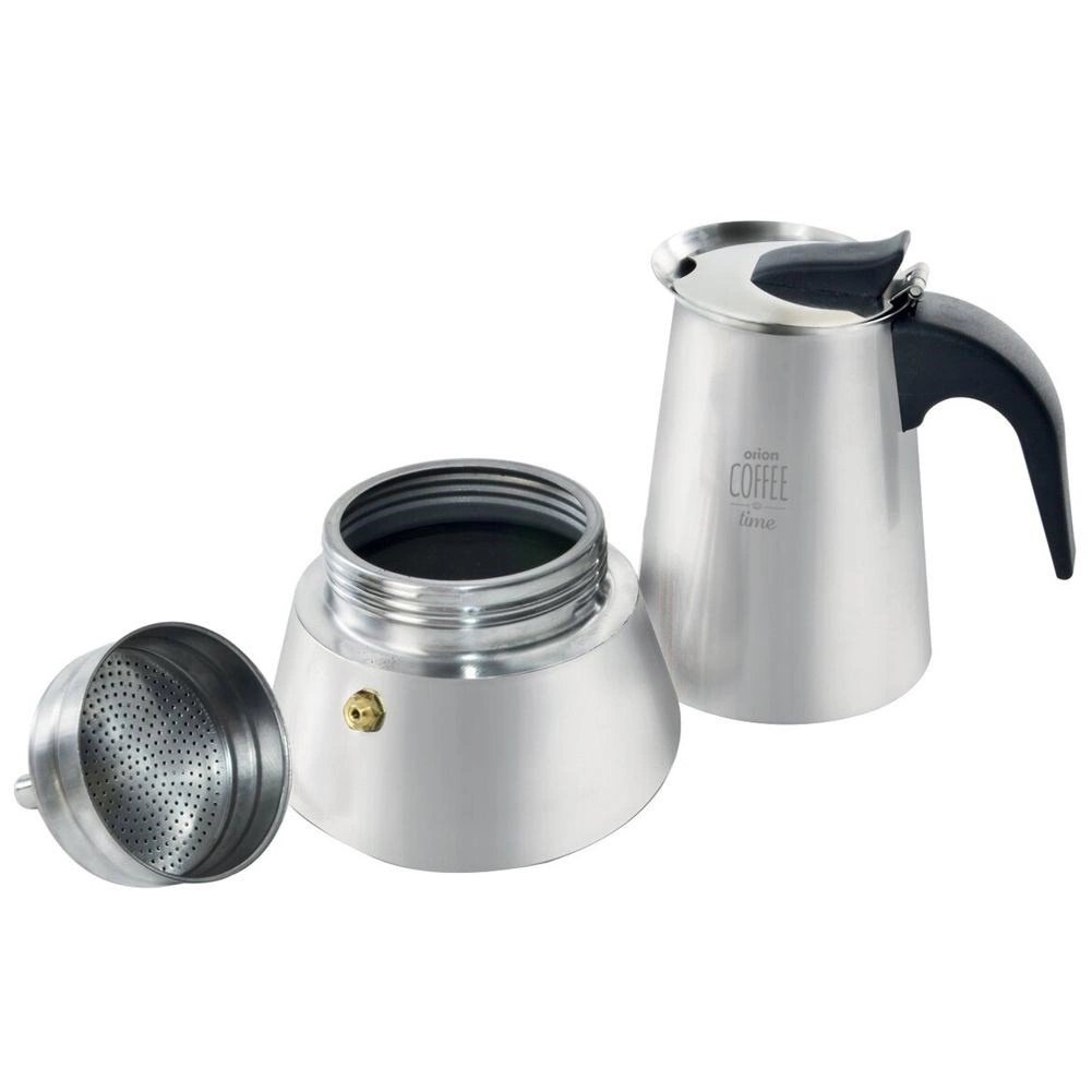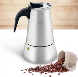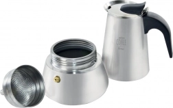 Elegantní nerezová moka konvička o objemu 450 ml pro přípravu tradičního italského espressa až pro 9 šálků. Nabízí odolné nerezové provedení, pohodlnou ergonomickou rukojeť, bezpečnostní přetlakový ventil a snadné čištění, včetně možnosti mytí v myčce. Vhodná na všechny typy vařičů kromě indukce.