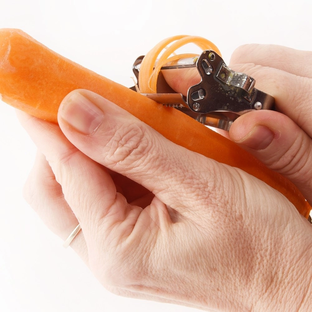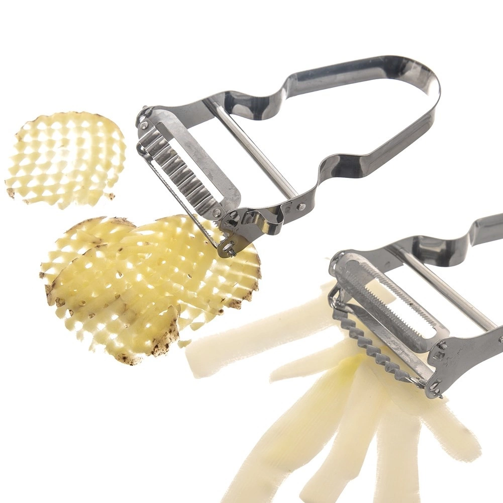 Jeden břit pro rychlé loupání, druhý pro vlnkované plátky a jemné proužky – ideální na křupavé chipsy nebo efektní ozdoby z brambor a zeleniny.