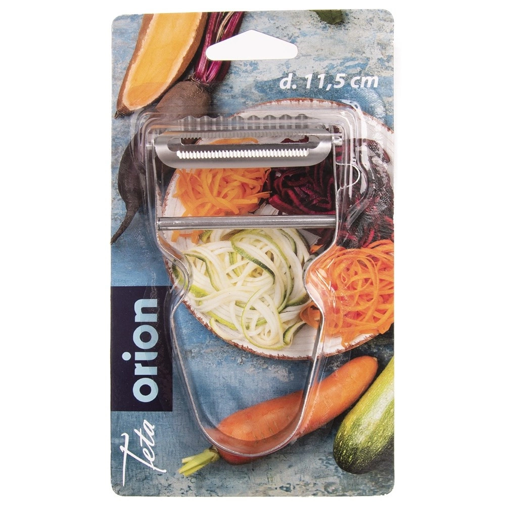 Tato univerzální nerezová škrabka usnadní přípravu zeleniny i ovoce – od brambor a jablek až po rajčata. Dva ostré břity zvládnou klasické loupání, krájení tenkých plátků a také ozdobné vlnkované řezy či jemné proužky na saláty a dekorace.