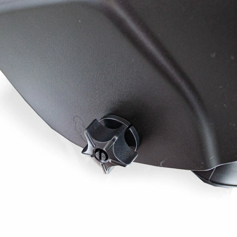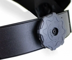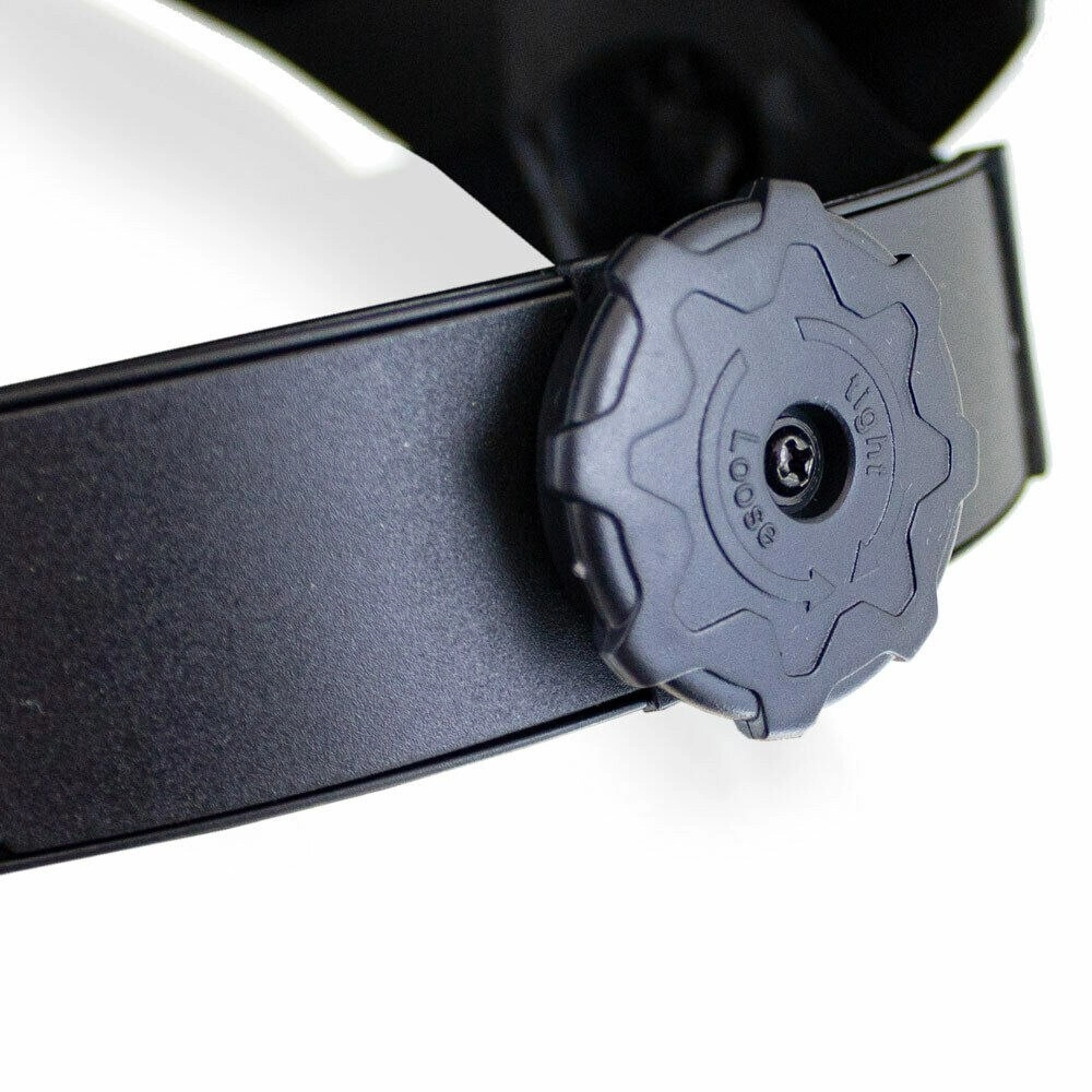 Polstrovaný a plně nastavitelný hlavový pás s rychlým utahovacím kolečkem drží kuklu stabilně a zvyšuje komfort i při dlouhých směnách.