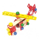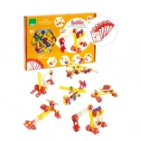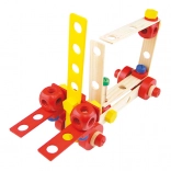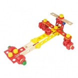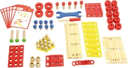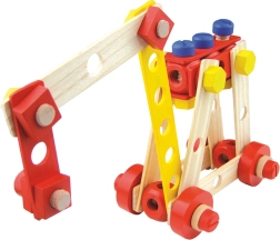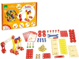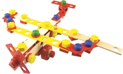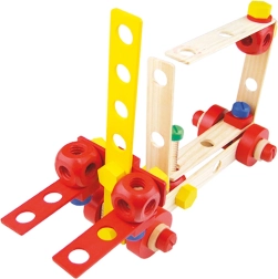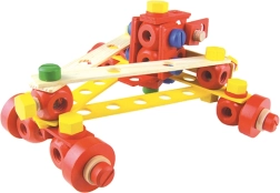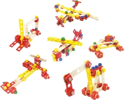 Barevné i přírodní slatě, šrouby, matice, kola a spojky umožní dětem skládat vozidla i fantazijní konstrukce a stále znovu je přestavovat.