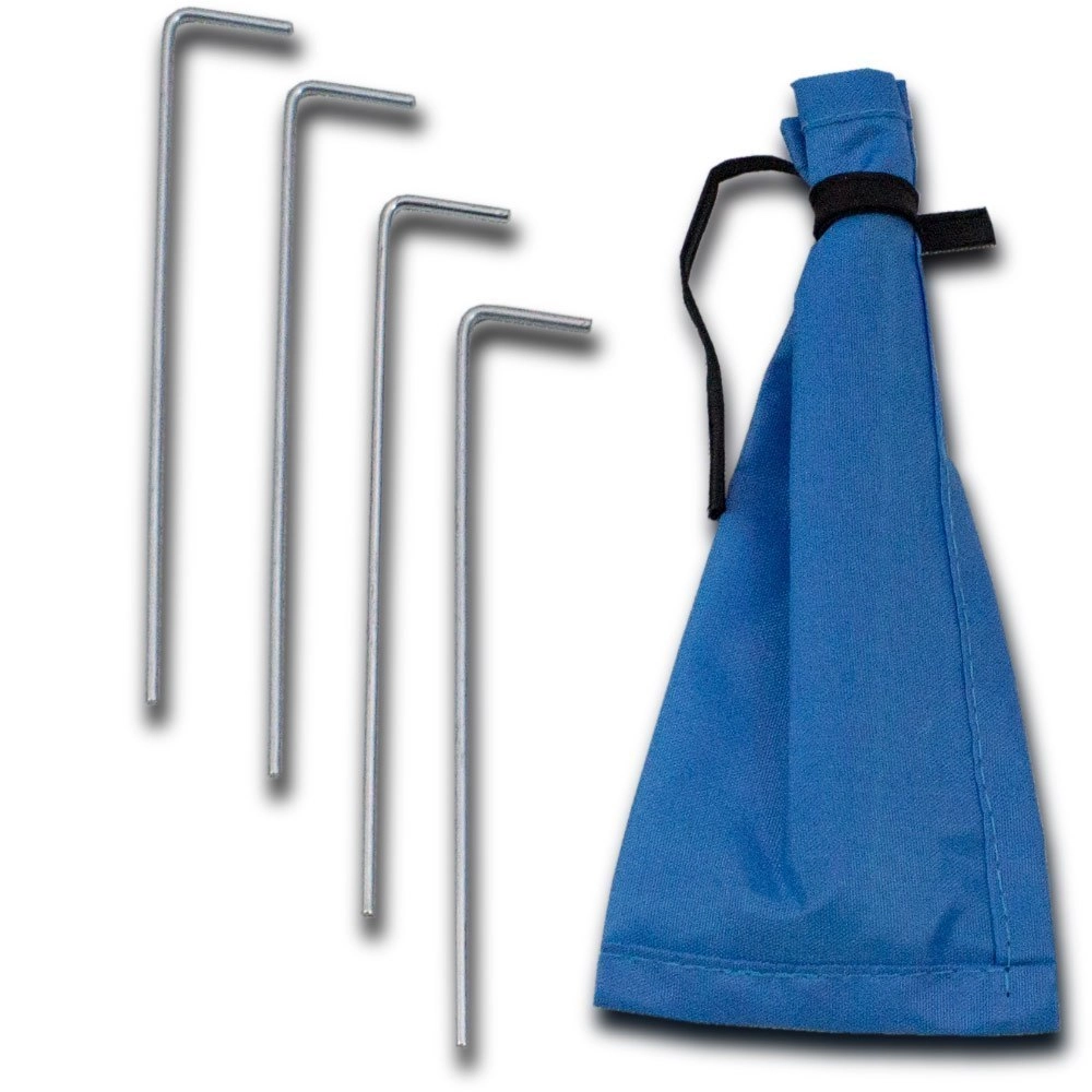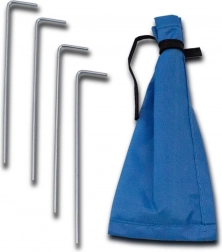 Sada obsahuje čtyři kovové kolíky v pouzdře pro bezpečné ukotvení na zahradě či v parku.