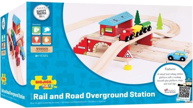 Tato pestrobarevná dřevěná hračka replikuje ikonické londýnské nadzemní stanice. Obsahuje rozeznatelné londýnské značky, stanoviště taxi, pokladnu a schody na nástupiště, což dělá z této hračky skvělý doplněk ke každé dřevěné vláčkové soupravě. Velká Stanice Nad Cestou umožňuje účastníkům silničního provozu projíždět pod stanicí, zatímco vlak přijíždí a odjíždí. Připojuje železniční dráhu a vozovku, což dětem poskytuje nespočet možností k interakci a hrám.
