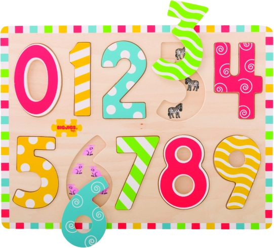 Dřevěná skládanka od Bigjigs Toys je ideálním nástrojem pro výuku počítání. Pomáhá rozvíjet schopnosti dětí, zlepšuje koordinaci a zajišťuje koncentraci díky veselým obrázkům.