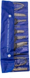 Modré skládací pouzdro s průhlednými kapsami a patentkami udržuje všech 20 kusů bezpečně na jednom místě a urychluje práci.
