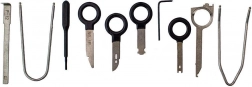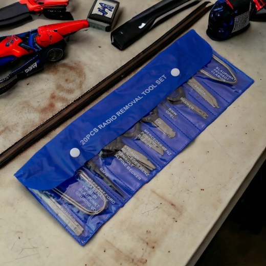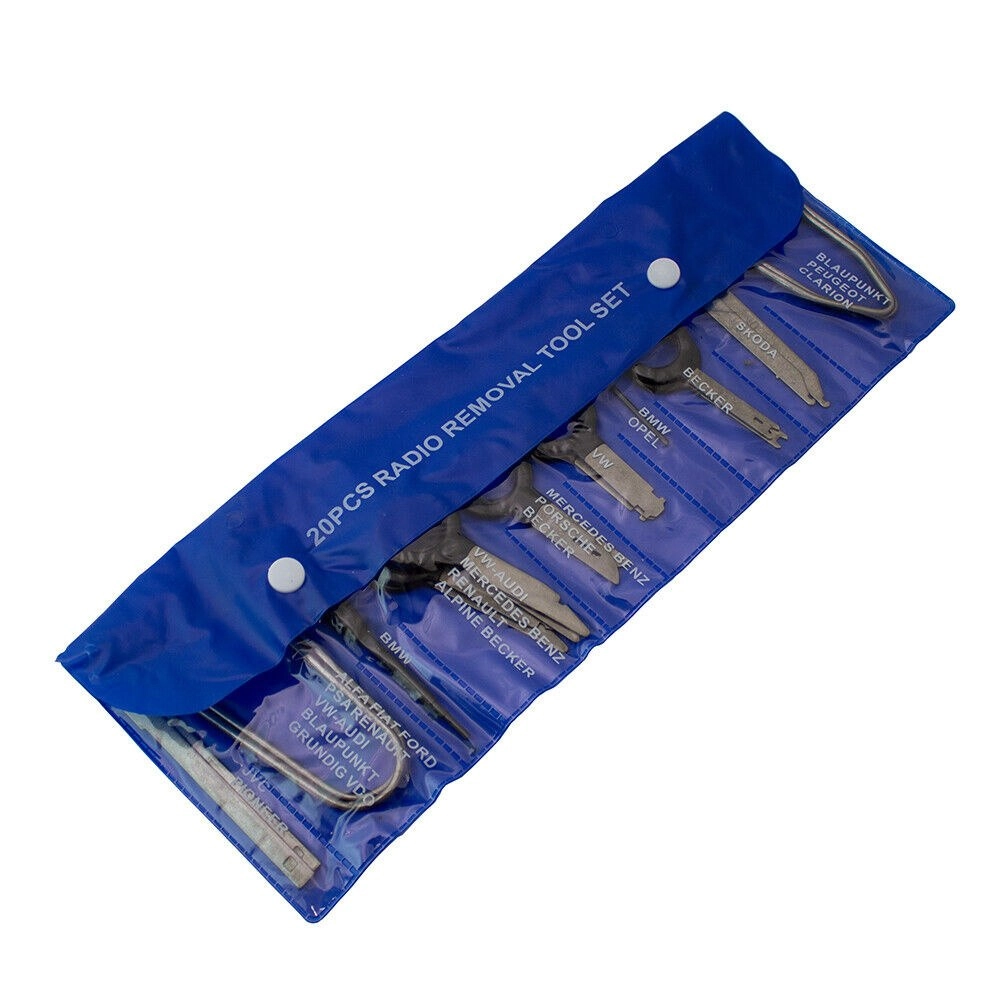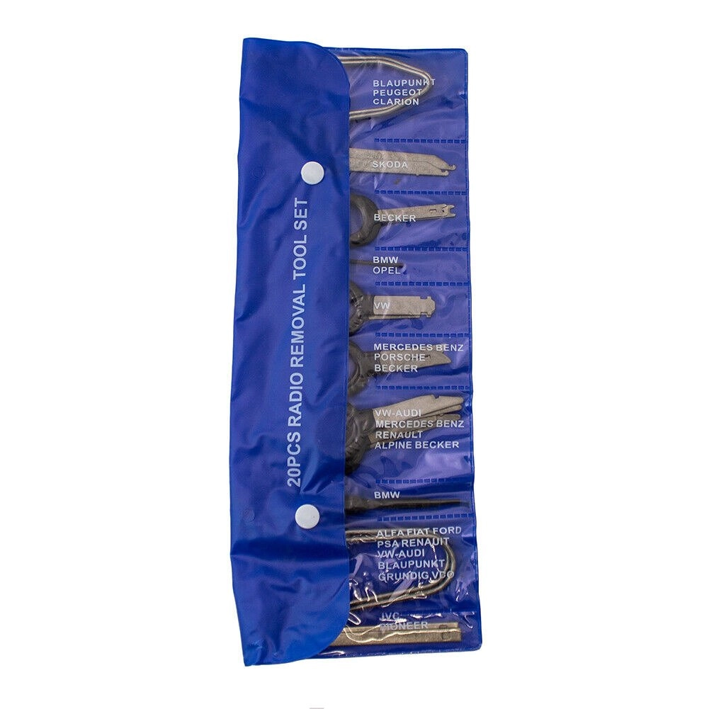 Tato profesionální 20dílná sada pro demontáž autorádií je ideální pro autoservisy i domácí kutily. Různé typy kovových klíčů, U‑profily a vytahováky uvolní zajišťovací západky a umožní rychlé vysunutí jednotky z palubní desky bez poškození okolních plastů.