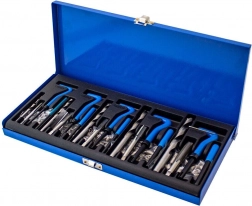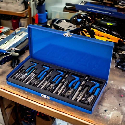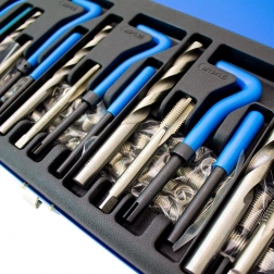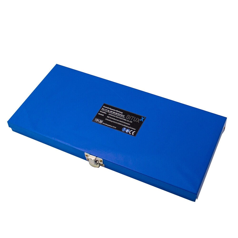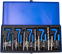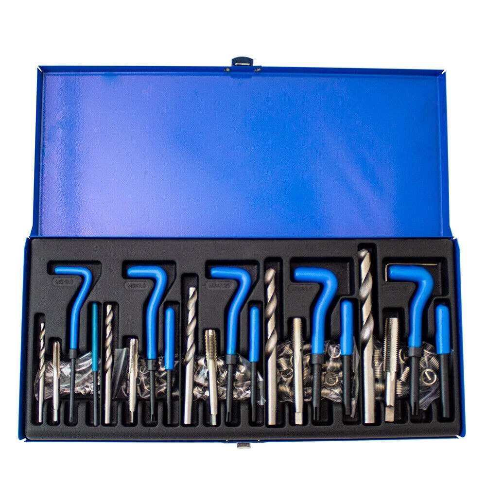 Profesionální sada na opravu závitů pro rozměry M5–M12 v odolném kovovém kufru. Obsahuje vše potřebné pro rychlou a spolehlivou renovaci poškozených závitů: vrtáky, závitníky, montážní trny, vytlačovače a spirálové vložky. Ideální pro dílny, servisy i hobby použití.