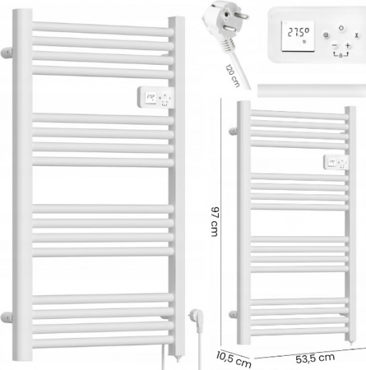 Radiátor nabízí 3 režimy provozu, týdenní program a praktický časovač – můžete si naplánovat topení přesně podle svého denního rytmu. Díky elektrické technologii bez zalévání kapalinou se zařízení rychle nahřívá, je lehčí a eliminuje rizika spojená s únikem média. Krytí IP24 zajišťuje bezpečný provoz v koupelně. Součástí balení jsou montážní úchyty pro snadnou instalaci, napájecí kabel (110 cm) je vyveden na pravé straně.