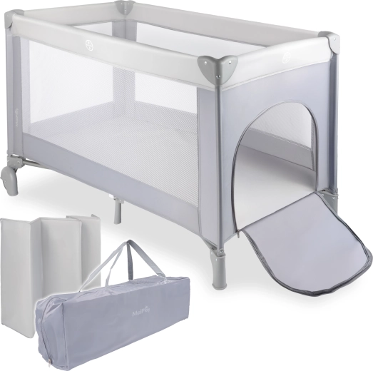 Praktická cestovní postýlka v elegantní šedé barvě nabízí rychlé rozkládání a skládání s bezpečnostní blokací, pohodlný transport díky 2 kolečkům a vzdušnost díky 3 síťovaným stěnám. Součástí balení je matrace 60 × 120 cm a přepravní taška; maximální nosnost je 15 kg.