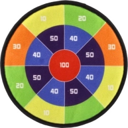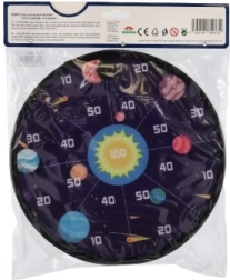 Jedna strana terče je navržena přitažlivými barvami a čísly pro tradiční hru, zatímco druhá strana přináší vesmírnou tematiku s obrázky planet. Děti mají možnost procvičovat matematiku při sčítání bodů podaných jednotlivými hody.