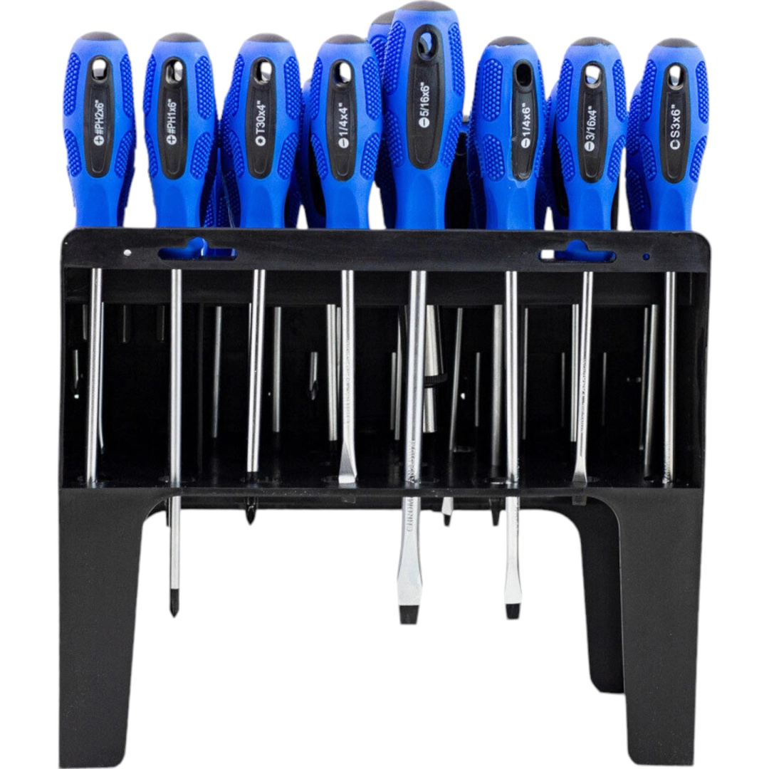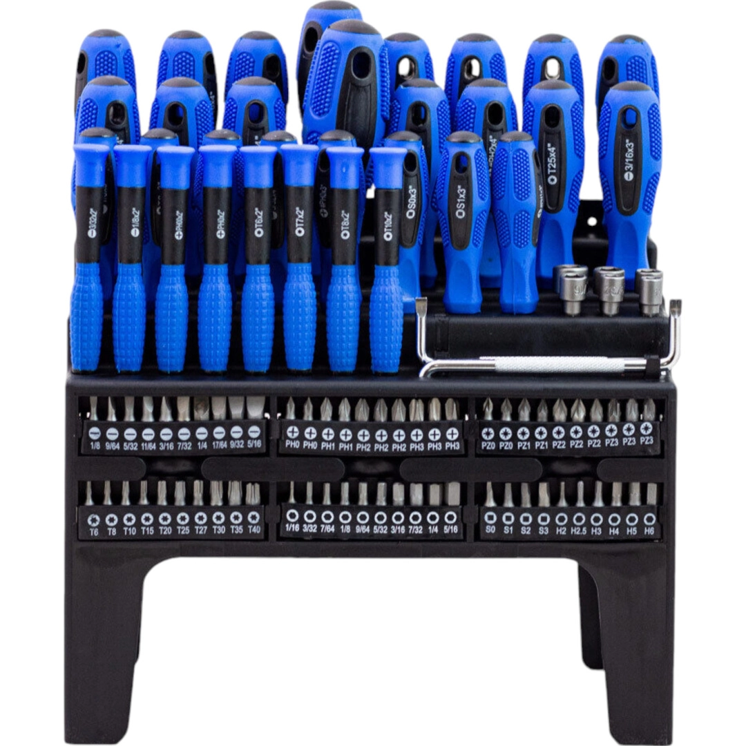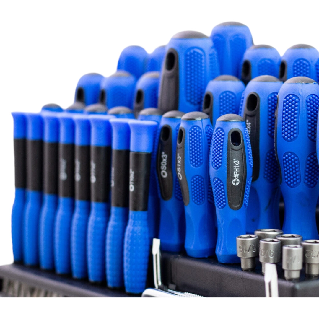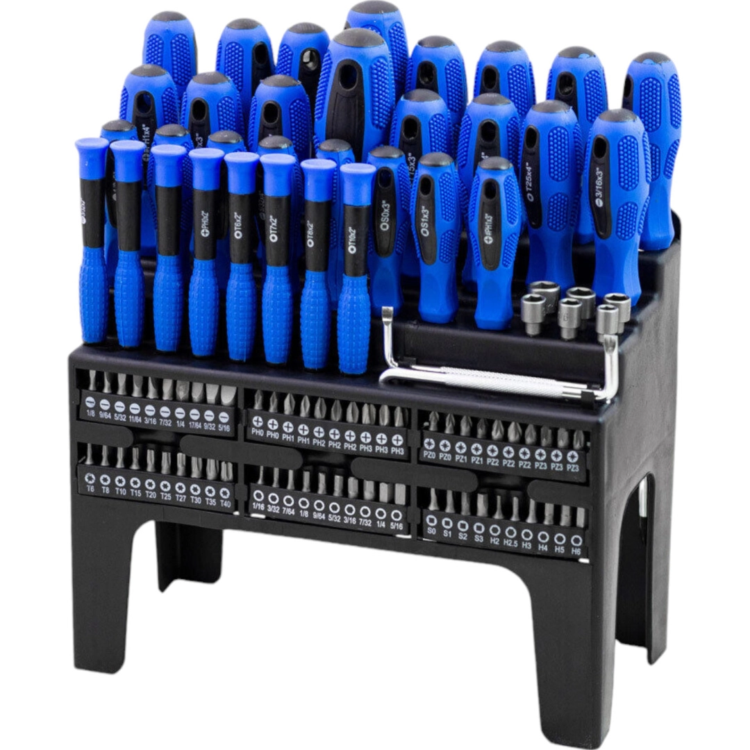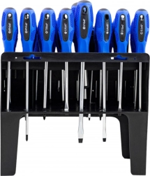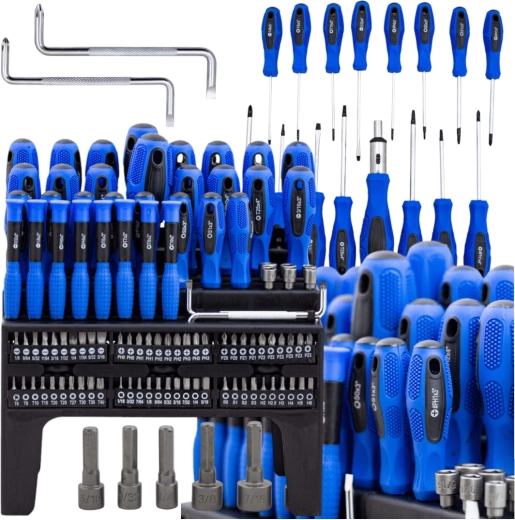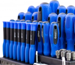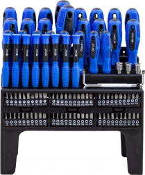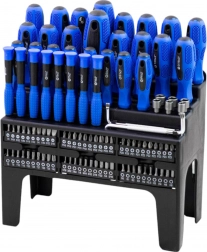 Součástí je odolný stojan, který udrží vše přehledně na jednom místě – od šroubováků a hodinářských kusů po nástrčné bity a hlavice. Díky bohaté skladbě je sada ideální do domácnosti, garáže i profesionální dílny.