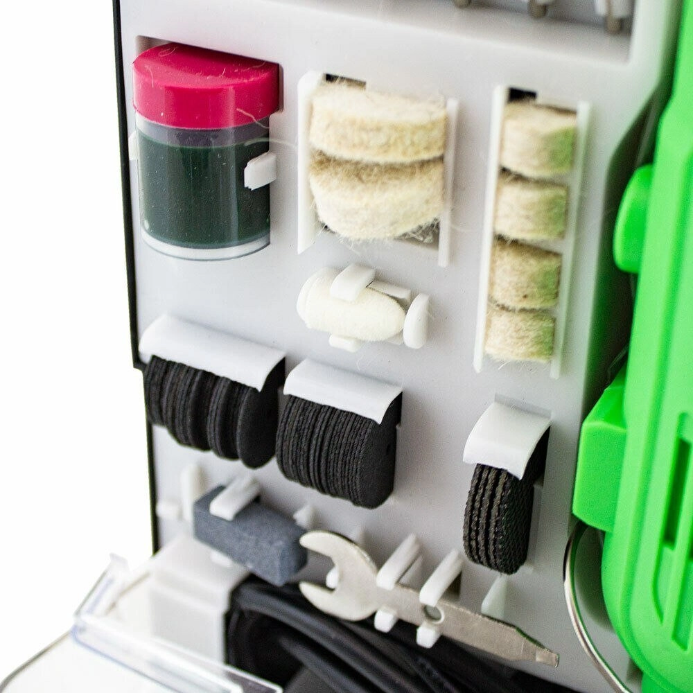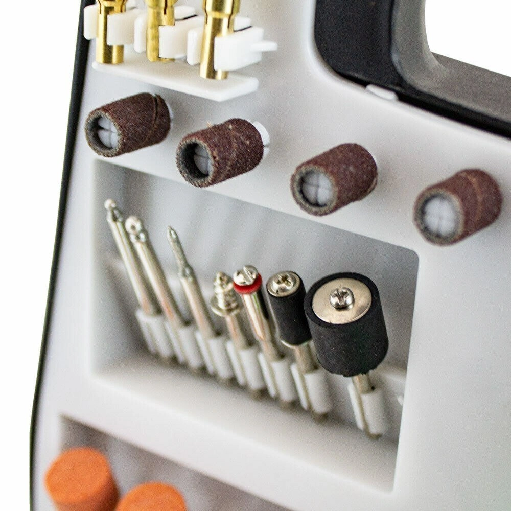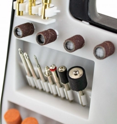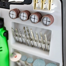 Organizér obsahuje brusné kameny, kotoučky, filce, frézy, vrtáky a další nástavce pro univerzální použití.