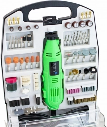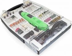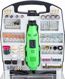 Součástí je 233dílná sada s brusnými kameny, řeznými kotoučky, lešticími filci, vrtáky, frézami a dalšími doplňky v přehledném organizéru. Snadno tak přepnete mezi broušením, řezáním, frézováním, vrtáním nebo leštěním a rychle dokončíte drobné opravy i kreativní projekty.