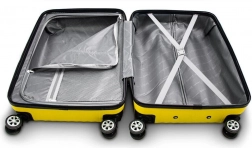 Každý kufr má teleskopické madlo s nastavitelnou výškou a dva nosné úchyty (nahoře a na boku) pro snadné nakládání do auta nebo přenášení po schodech. Uvnitř najdete zipovou přepážku s kapsou a křížové popruhy pro přehledné balení bez pomačkání.