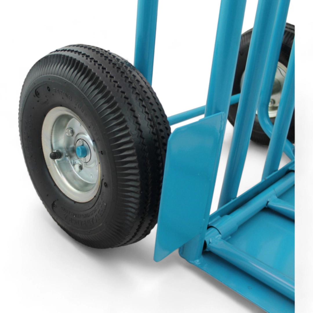 Velká nafukovací kola zajišťují stabilitu, tlumí nárazy a ulehčují jízdu po dlažbě, štěrku i trávníku s plným nákladem.