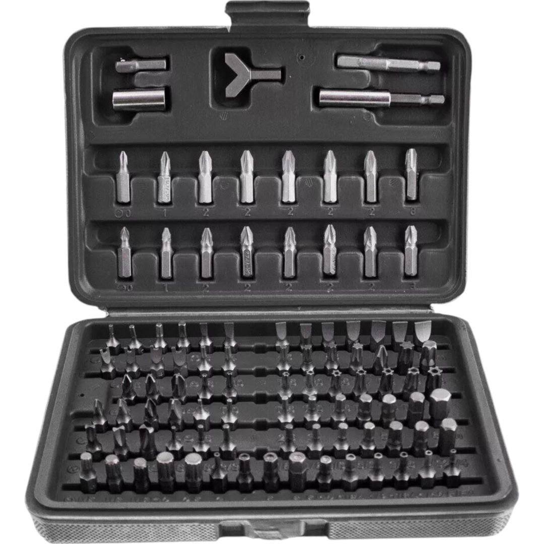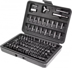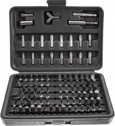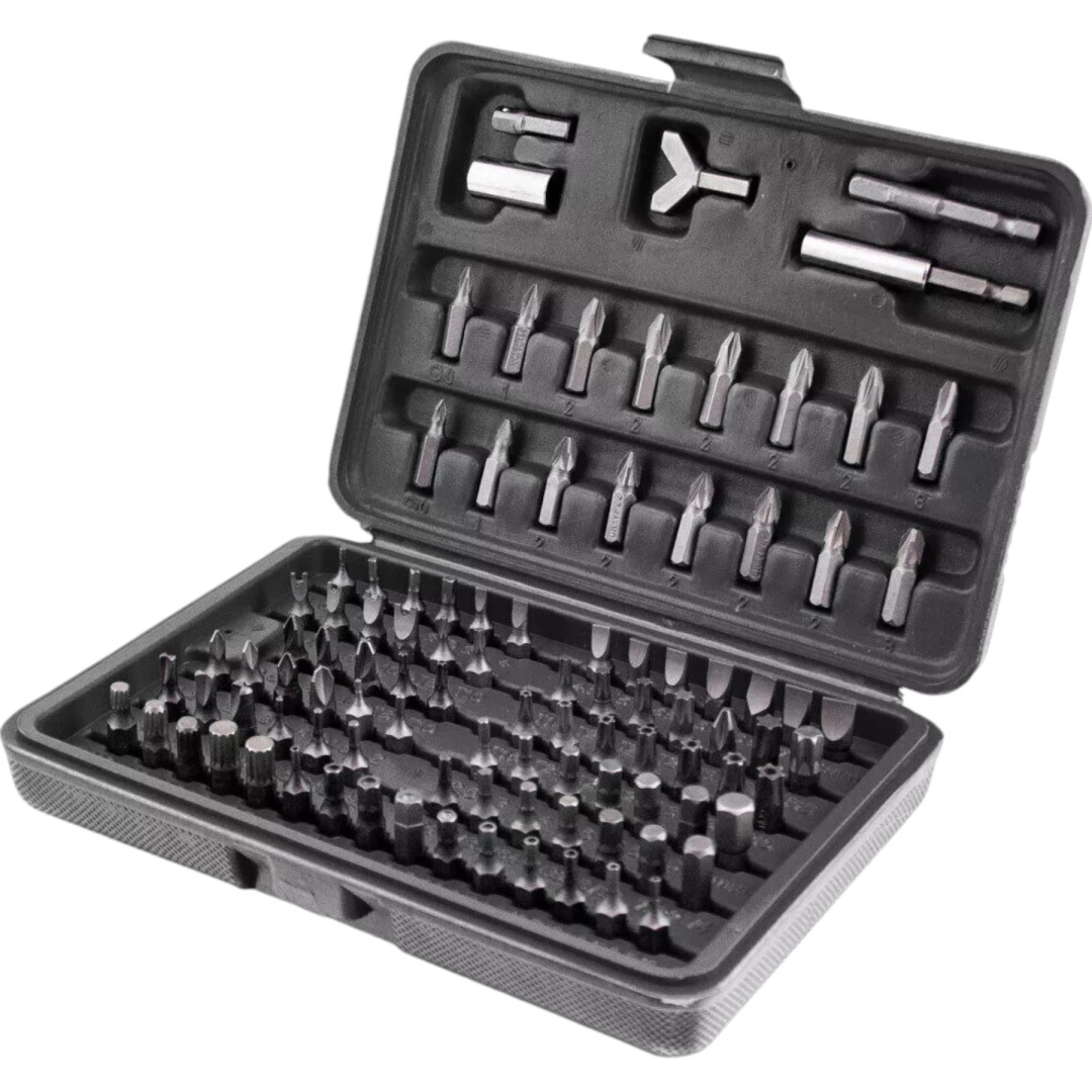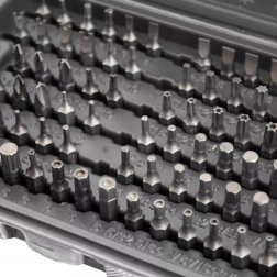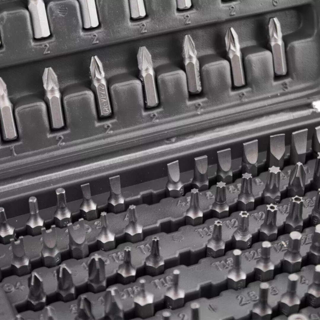 Tato komplexní sada nabízí širokou škálu nástavců – ploché, křížové PH a PZ, TORX i TORX s otvorem, metrické i palcové imbusy, bezpečnostní bity typu tri‑wing, spanner, Robertson (SQ), XZN a další. Odolná ocel zajišťuje dlouhou životnost a spolehlivost při montáži, servisu i opravách.