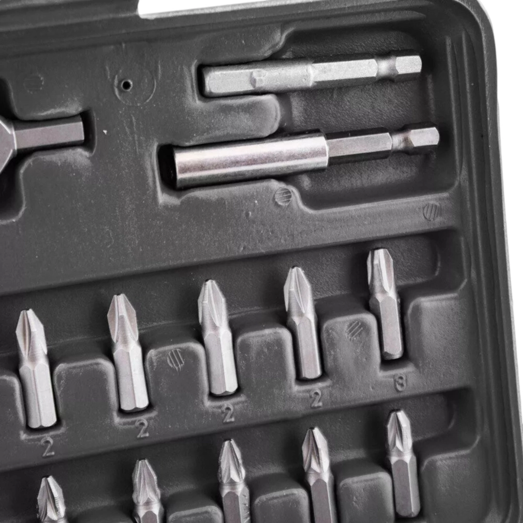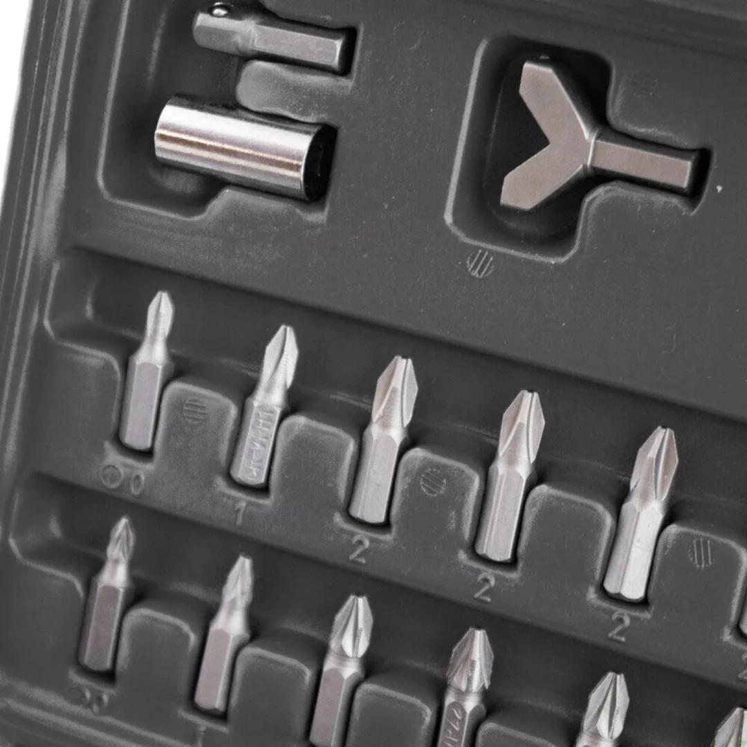 Pevné plastové pouzdro udržuje každý bit na svém místě, takže máte vždy pořádek a rychlý přístup. Díky kompaktním rozměrům je set ideální do dílny, auta i na cesty.