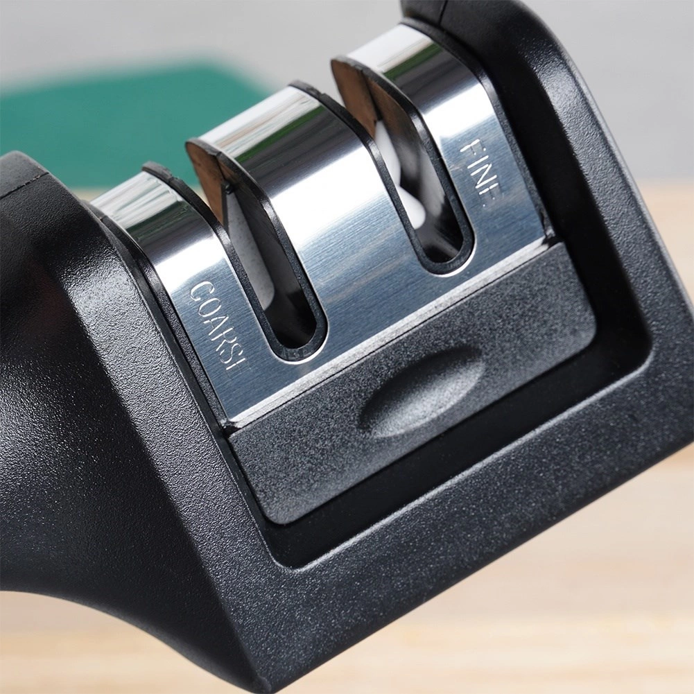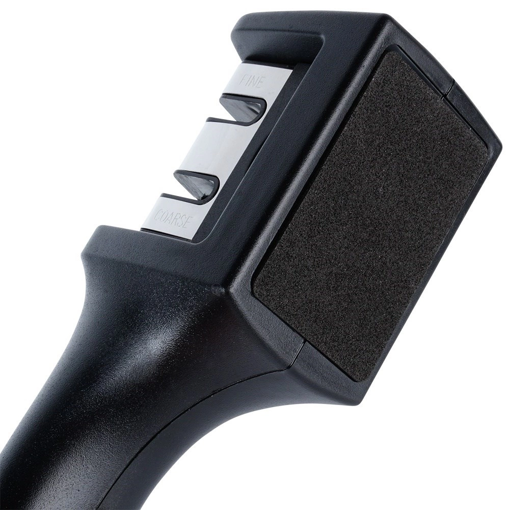 Hrubý karbid obnoví tvar ostří, jemná keramika jej vyhladí a doostrí – ideální kombinace pro každodenní údržbu nožů.