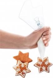 Sáčky jsou vyrobené z odolné, zdravotně nezávadné fólie a hodí se pro studené i teplé krémy, polevy, šlehačku, bílkové hmoty či slané paštiky a náplně. Velikost otvoru si snadno upravíte odstřižením špičky, takže získáte přesně takový průměr, jaký potřebujete pro dekorování.