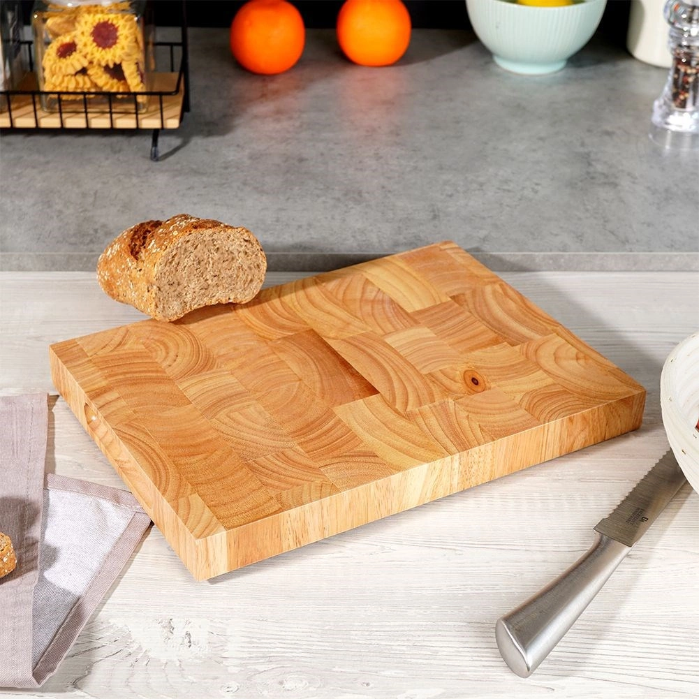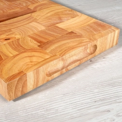 Robustní dřevěná krájecí deska o rozměrech 35 × 25 × 3,3 cm z kvalitního kaučukového dřeva. Díky konečnému řezu (end-grain) je šetrná k ostří nožů, odolná vůči poškození a skvěle stabilní. Integrované postranní úchyty pro snadné přenášení a elegantní vzhled pro servírování sýrů, uzenin či pečiva.
