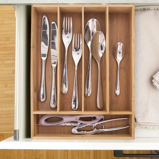 Čtyři úzké sekce na příbory a jedna širší na kuchyňské náčiní udrží vše přehledně rozdělené a snadno dostupné.