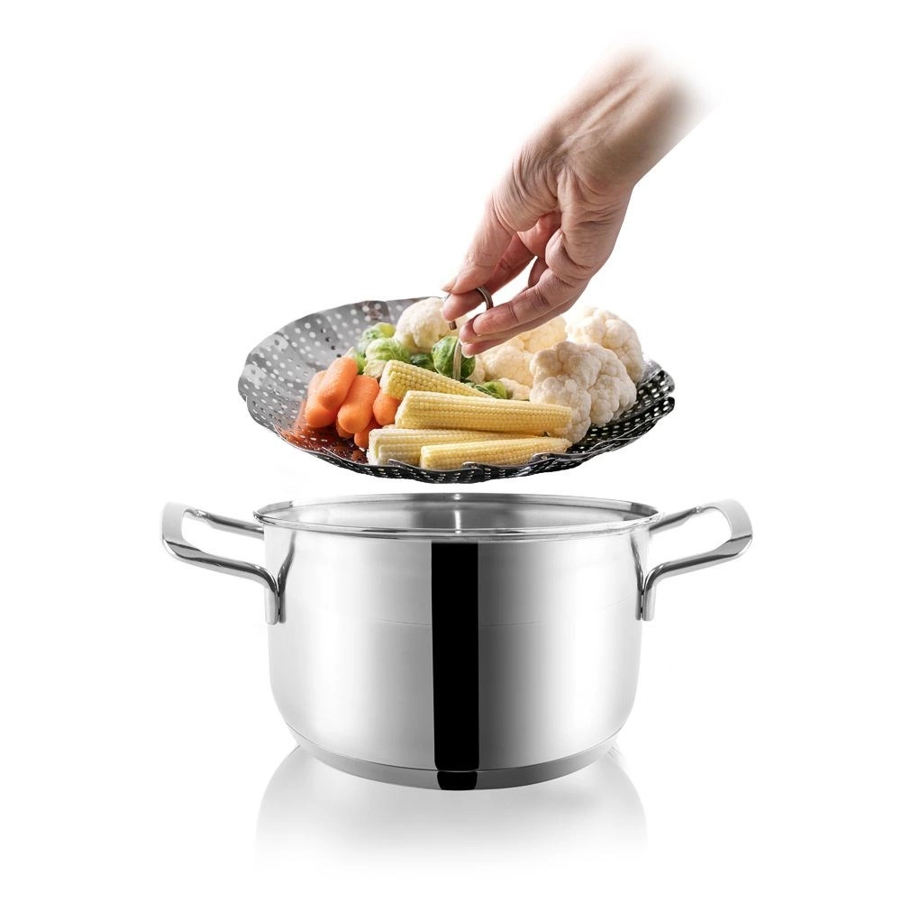 Univerzální skládací pařák ze nerezové oceli o průměru 14–23 cm pro zdravé vaření v páře zeleniny, ryb, masa i knedlíčků. Díky skládací konstrukci padne do různých hrnců, je snadno omyvatelný a vhodný do myčky nádobí.