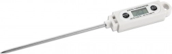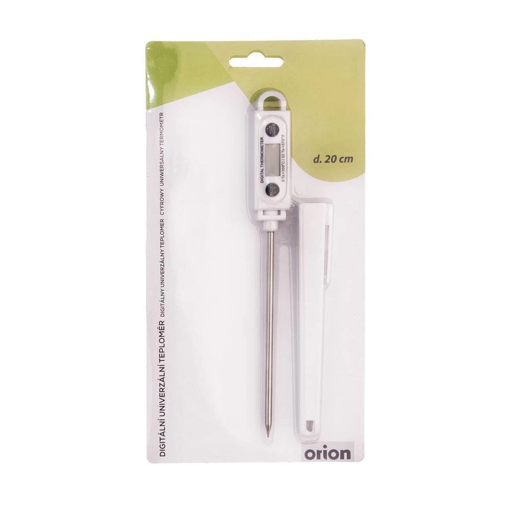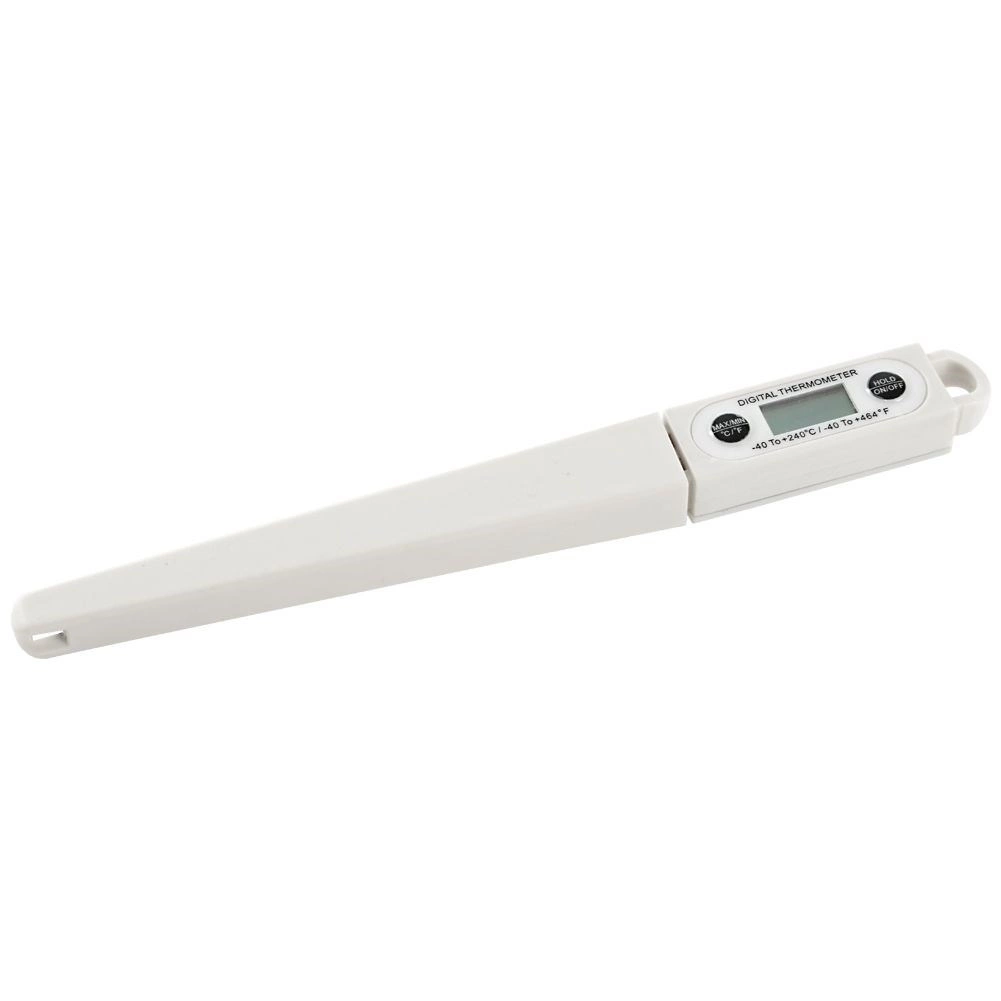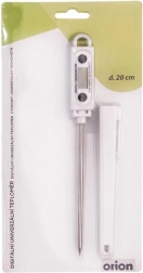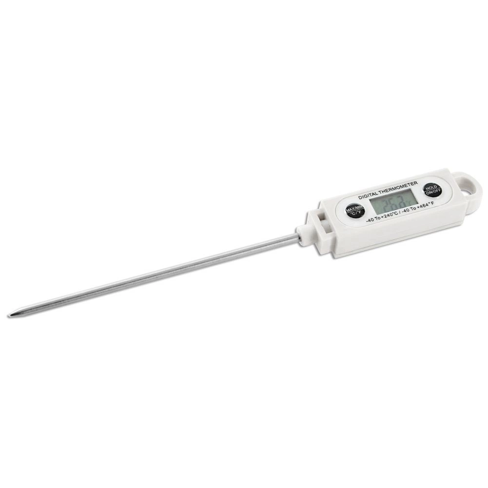 Praktický kuchyňský teploměr s vpichovou sondou a LCD displejem pro přesné měření teploty masa i tekutin. Nabízí rozsah měření 0–300 °C (také 32–572 °F), jemné krokování po 0,1 °C a je vyroben z nerezové oceli a odolného plastu. Ideální pro vaření, pečení, smažení, grilování i uzení. Napájení zajišťuje baterie LR754 (součástí balení).