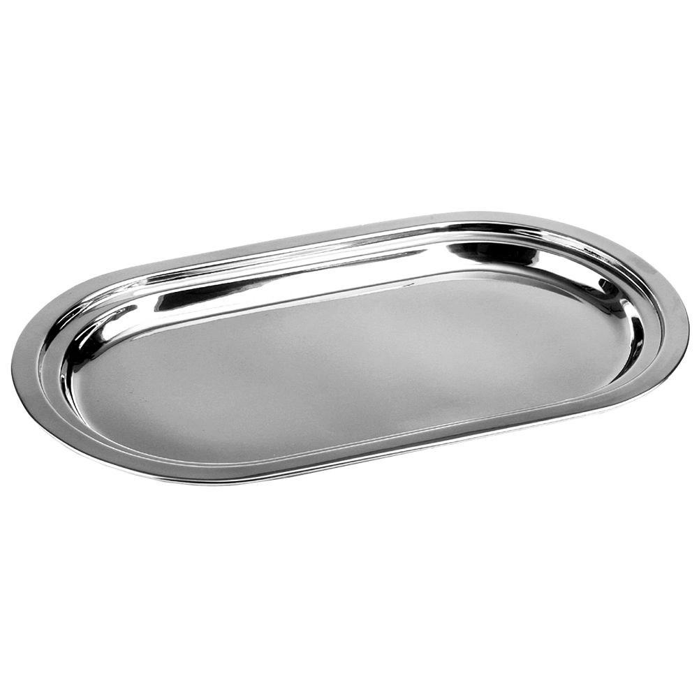 Stylový oválný tác je vyroben z odolné nerezové oceli s vysokým leskem, která je snadno omyvatelná a odolná vůči skvrnám a korozi. Praktický zvýšený okraj usnadňuje přenášení a brání sklouznutí pokrmů.