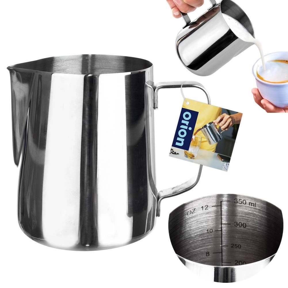 Nerezový džbánek na mléko s objemem 350 ml je ideální volbou pro domácí i kavárenskou přípravu kávy. Díky přesné výlevce snadno nalijete mléko do cappuccina či latté a vnitřní ryska po 50 ml zajistí přesné odměření potřebného množství. Pevné ergonomické ucho usnadňuje manipulaci i při horkém obsahu.