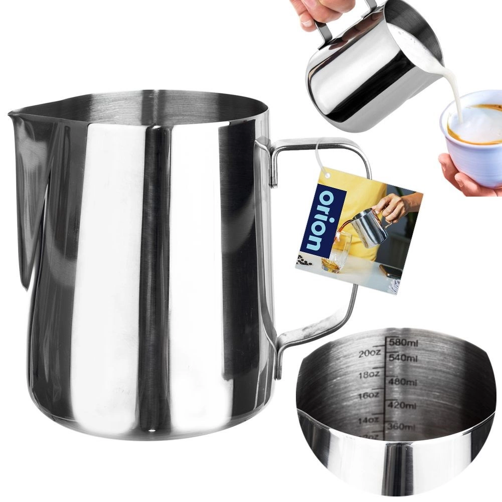 Praktický nerezový džbánek na mléko o objemu 580 ml s vnitřní měrkou pro přesné dávkování je ideální pro přípravu kávy a latte art. Nabízí odolné provedení z nerezové oceli, pohodlné nalévání díky přesnému zobáčku a bezpečný úchop. Vhodný pro ohřev na plynové, elektrické i sklokeramické varné desce (nevhodný pro indukci).