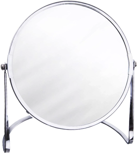 Elegantní dvoustranné kosmetické zrcátko na stojanu se stříbrným rámem je ideální pro líčení i každodenní péči. Nabízí klasické zobrazení i 2× zvětšení, má průměr zrcadlové plochy 17 cm a působí stylově a minimalisticky v každém interiéru.