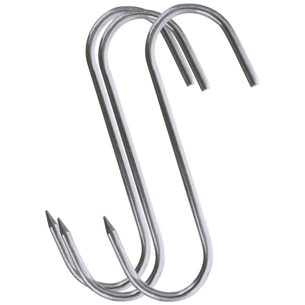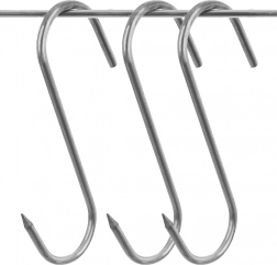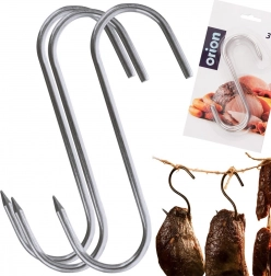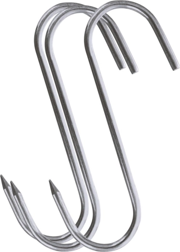 Sada tří nerezových háků do udírny o rozměrech 13,5 × 9 cm a průměru 0,5 cm je ideální pro domácí i profi uzení. Ostré zakončení na jedné straně usnadňuje napíchnutí větších kusů masa, zatímco otevřený tvar S umožní rychlé zavěšení na tyče v udírně.