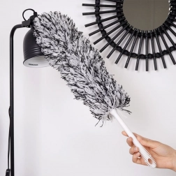 Pevná plastová rukojeť v bílé barvě skvěle padne do ruky a umožňuje jistý úchop. Hlavice z polyesterového mikrovlákna je odolná a šetrná k citlivým povrchům – vhodná pro obrazovky, lakované plochy i dekorace. Po úklidu ji snadno zavěsíte za praktické očko.