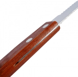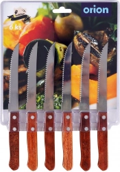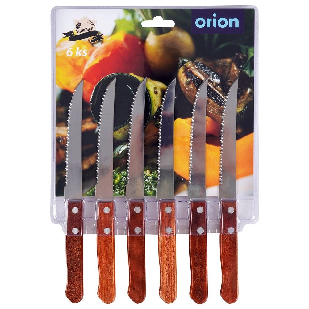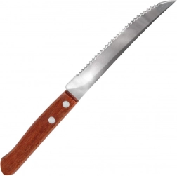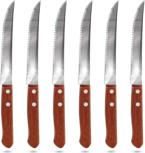 Praktická sada 6 steakových nožů o délce 20,5 cm se zoubkovaným nerezovým ostřím pro snadné krájení masa, burgerů i pizzy. Dřevěné rukojeti s nýtováním zajistí pevný úchop a pohodlné používání. Díky ostré zoubkové čepeli si poradí i s tvrdším masem a všestranně se hodí jak pro domácí stolování, tak pro grilování či gastronomii.